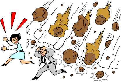 - 山ぎわや急傾斜地域では、山崩れ、がけ崩れが起こりやすいので、自分ですばやく決断し、ただちに避難しましょう。