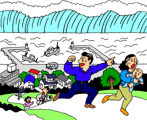 - 強い地震(震度4程度以上)を感じたとき、または弱い地震であっても長い時間ゆっくりとした揺れを感じたときは、直ちに海浜から離れ、急いで高台になどの安全な場所へ避難しましょう。