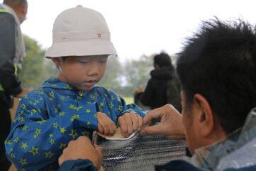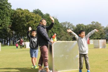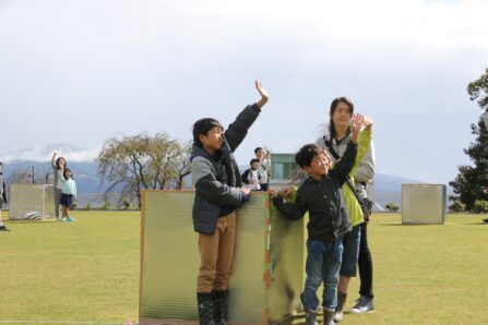続いて簡易コーナーリフレクターを親子で仲良く作製し、11時47分頃に上空を通過した「だいち2号」に写り込むよう、「令」の字を作りました。後日確認した「だいち2号」からの写真には、しっかり「令」の字が写っていましたよ。