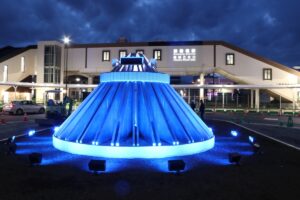 ・広場中央には、時計一体型の富士山をイメージしたモニュメントが観光客をお出迎え。