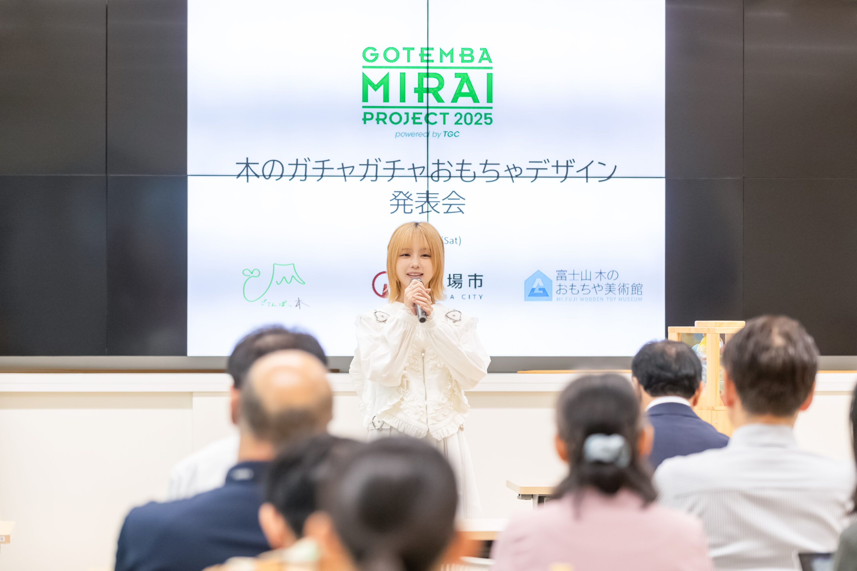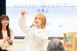 その後、来年夏にオープン予定の富士山木のおもちゃ美術館に設置されるカプセルトイ用の木のおもちゃデザ イン発表会が行われました。