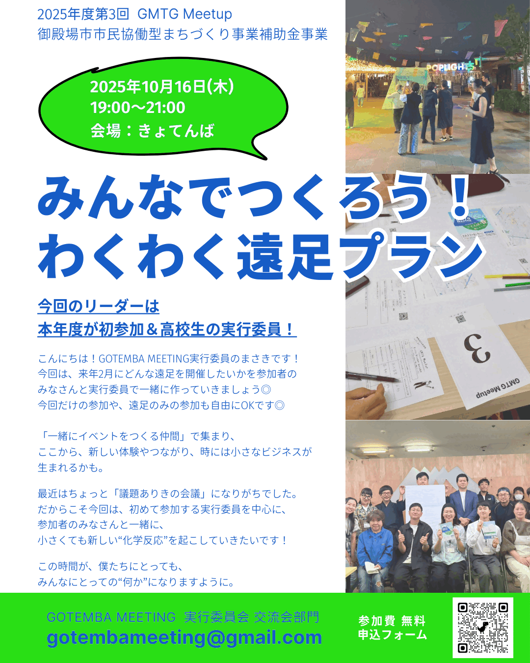 令和7年10月16日(木)、『GMTG Meetup(ジーエムティージーミートアップ) vol.3 -みんなでつくろう!わくわく遠足プラン-』が開催されます。