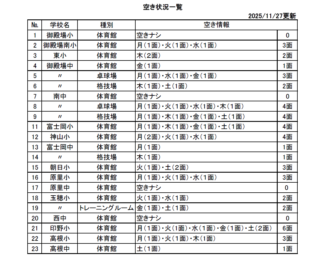 学校の体育館(卓球場含む)及び格技場を、午後7時から午後9時まで利用可能です。