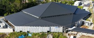 ・鉄骨工事が概ね完了し、屋根工事に着手しました。雨水の侵入を防ぐため、防水処理を行っています。