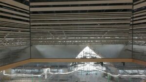・内部では足場を組み、ルーバー天井や内屋根の施工を行っています。