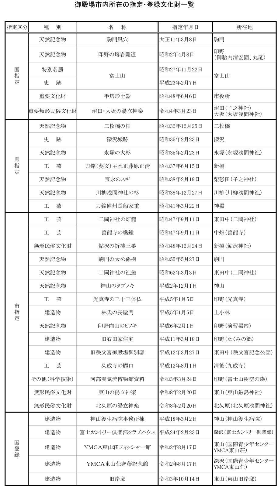 指定・登録文化財 指定・登録文化財一覧 ※令和8年2月20日現在。 ※指定区分ごとの指定年月日順に掲載しました。 ■御殿場市文化財のしおり等一覧 御殿場市文化財のしおり等一覧(販売可能書籍) 御殿場市文化財のしおり等一覧(図書館閲覧書籍) ■富士山御殿場登山道 ■御殿場デジタル資料館 問い合わせ 社会教育課 TEL:0550-82-4319