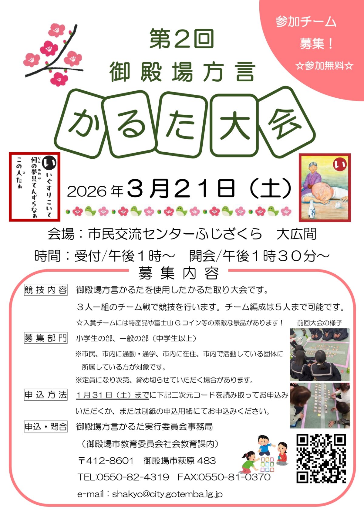 各部門ごと3人一組のチームで対戦し、入賞チームには御殿場市の特産品や富士山Gコインなどの素敵な賞品があります。奮ってご参加ください!