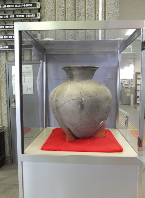 発見当時、この甕はバラバラに割れた状態でしたが、接合作業が行なわれ、ほぼ完全な形に復元されました。市民が気軽に見に来ることができる場所で公開して欲しいという所有者の意向を受け、現在は市役所本庁1階にて展示・公開しています。